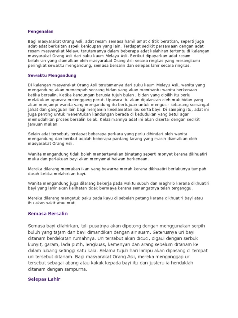 Adat dan pantang larang orang India (1994 edition) | Open ... from covers.openlibrary.org You are on page 1 of 2. Semelai adalah salah satu suku kaum orang asli dari suku bangsa melayu asli (proto malay). Walaupun orang asli dikatakan sebagai kelompok minoriti tapi pecahan suku kaumnya banyak sangat macam temiar, semaq beri,che wong, temuan, batek, kensiu dan orang kanaq. Ada orang mengatakan, kalau tak jaga pantang larang ini, ia mungkin menyebabkan masalah obesiti dan penghadaman. Tapi tahukah anda, ada pantang larang yang tak boleh dilakukan selepas minum madu. * dilarang memakan ikan yang mempunyai sengat (berbisa) * dilarang memakan rusa, siamang, ayam denak, tenggiling dan sebagainya bergantung kepada penyakit yang dihidapi dan mengikut pantang yang dikenakan oleh tok bomoh. Penerbitan jabatan hal ehwal orang asli. Dibahagi kepada tiga kumpulan yang terbesar iaitu negrito, senoi dan melayu asli.